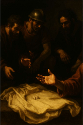 one piece from top to bottom. “Let’s not tear it,” they said to one another. “Let’s decide by lot